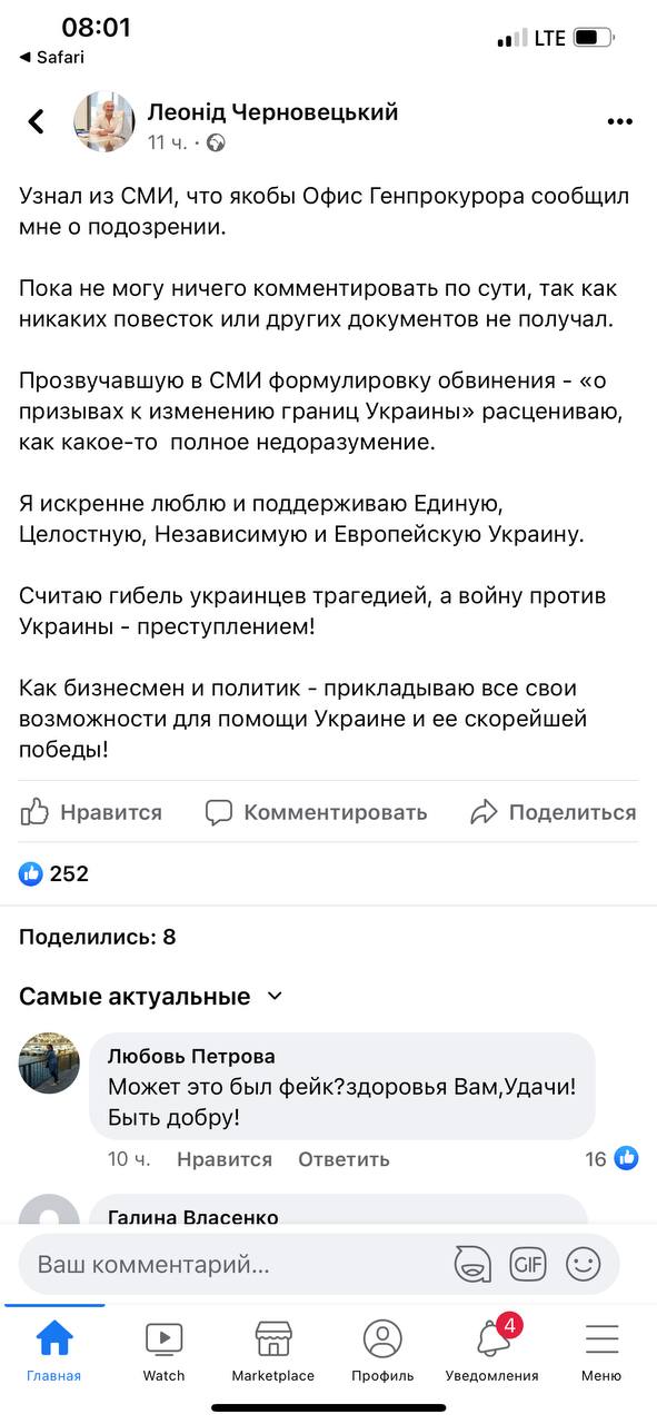 "Узнал из СМИ, что якобы Офис Генпрокурора сообщил мне о подозрении. Прозвучавшую в СМИ формулировку обвинения - "о призывах к изменению границ Украины" расцениваю, как какое-то полное недоразумение. Я искренне люблю и поддерживаю Единую, Целостную, Независимую и Европейскую Украину. Считаю гибель украинцев трагедией, а войну против Украины - преступлением!", - написал Черновицкий.