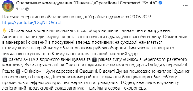 Об этом сообщает Оперативное командование "Юг".