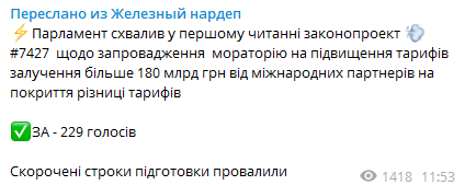 Правительственный законопроект №7427 сегодня принят в первом чтении, сообщил нардеп Ярослав Железняк.