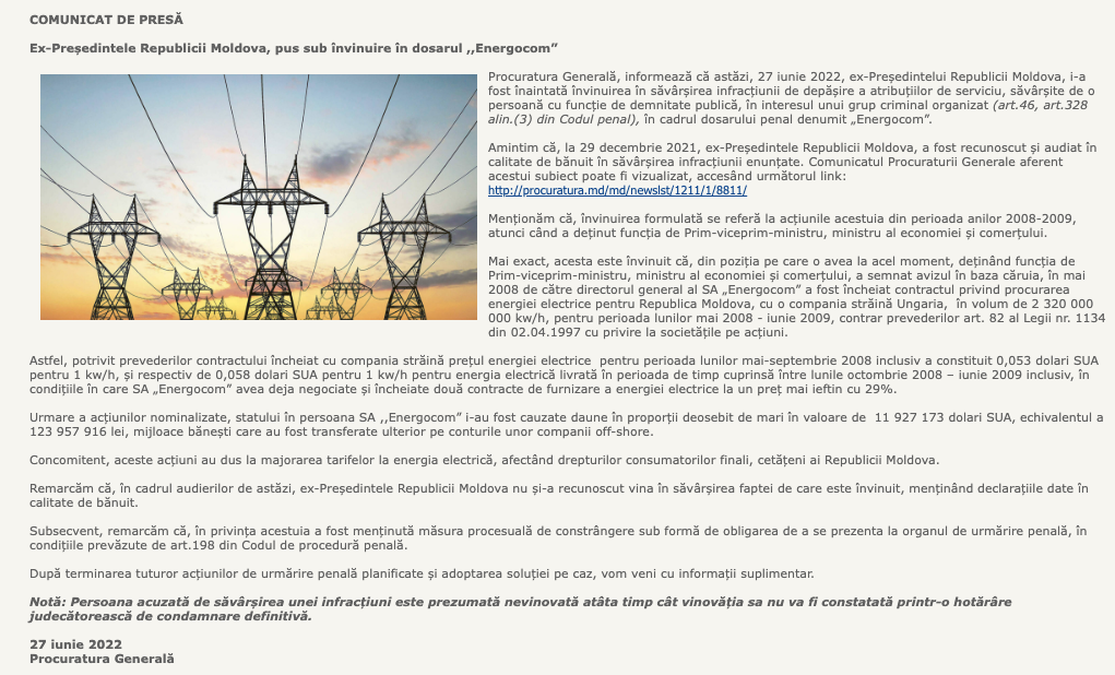 Дело "Энергоком" касается закупки электроэнергии в течение 2008-2009 годов через посредническую компанию. Предполагается, что мошенническая схема с импортом энергии, в результате которой из бюджета было похищено 12 миллионов долларов, была создана во время пребывания Игоря Додона на посту министра экономики.