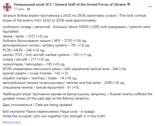 Потери личного состава российской армии с начала вторжения в Украину составили порядка 35 450 человек. За прошедшие сутки погибло около 200 военных РФ.