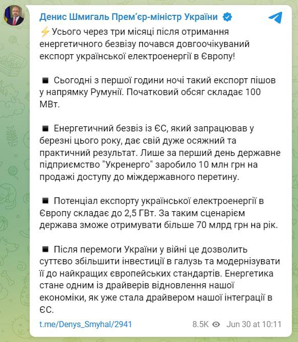 Украина с 30 июня возобновила экспорт электроэнергии в ЕС. Об этом сообщил премьер-министр Денис Шмыгаль в Telegram.