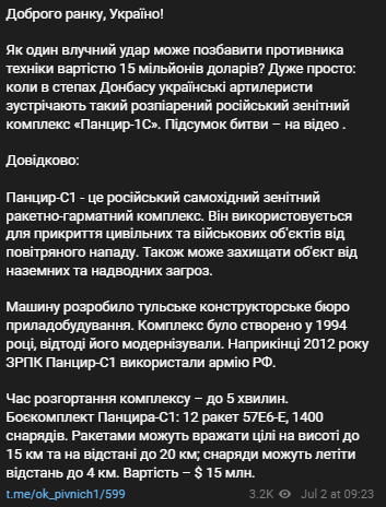 "Доброе утро, Украина! Как один меткий удар может лишить противника техники стоимостью 15 миллионов долларов? Очень просто: когда в степях Донбасса украинские артиллеристы встречают распиаренный российский зенитный комплекс "Панцирь-1С", - говорится в публикации.