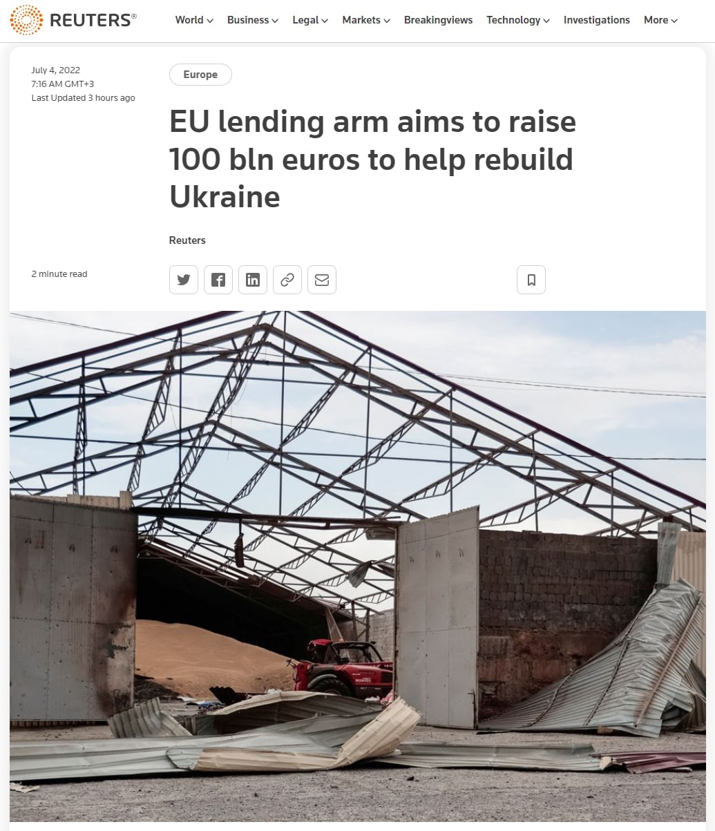 10:00 Европейский инвестиционный банк предлагает структуру финансирования, которая ранее использовалась во время пандемии Covid-19, для восстановления Украины.