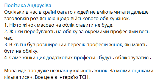 Речь идет об очень незначительном количестве женщин. По моим оценкам, несколько тысяч", - написал Андрусив в своем Телеграм-канале.