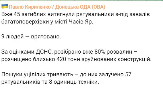 "Уже 45 погибших вытащили спасатели из-под завалов многоэтажки в городе Часов Яр. 9 человек спасены. По оценкам ГСЧС, разобрано уже 80% развалин – расчищено около 420 тонн разрушенных конструкций. Поиски уцелевших продолжаются – к ним привлечены 57 спасателей и 8 единиц техники", - написал Кириленко.