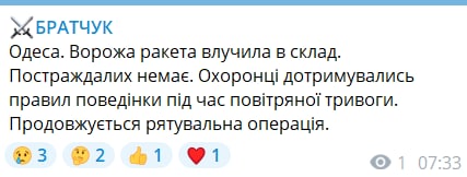 А в Одессе ракета попала в гражданский объект. Позже глава ОВА уточнил, что это был склад.