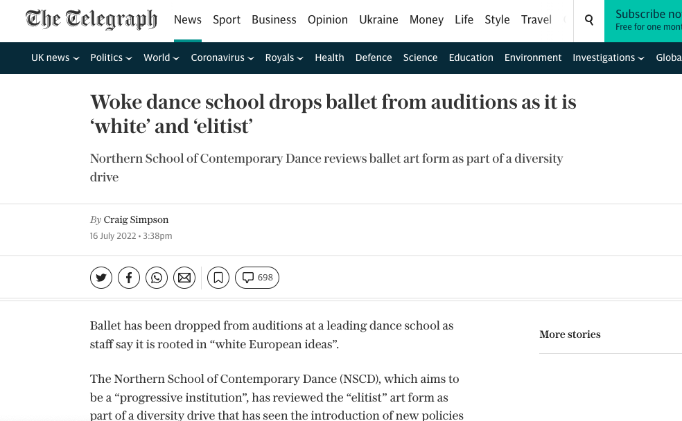В ведущей танцевальной школе Великобритании NCSD (Northern School of Contemporary Dance) исключили балет из вступительных экзаменов, потому что он основан на "белых европейских идеях".