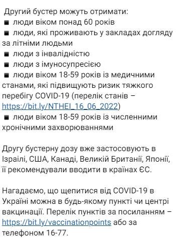 По данным Минздрава, вторую бустерную дозу можно будет вводить с интервалом не менее четырех месяцев после первой (третьей прививки). Для нее будут применять м-РНК- вакцину (в Украине сейчас доступна Comirnaty от Pfizer/BioNTech).