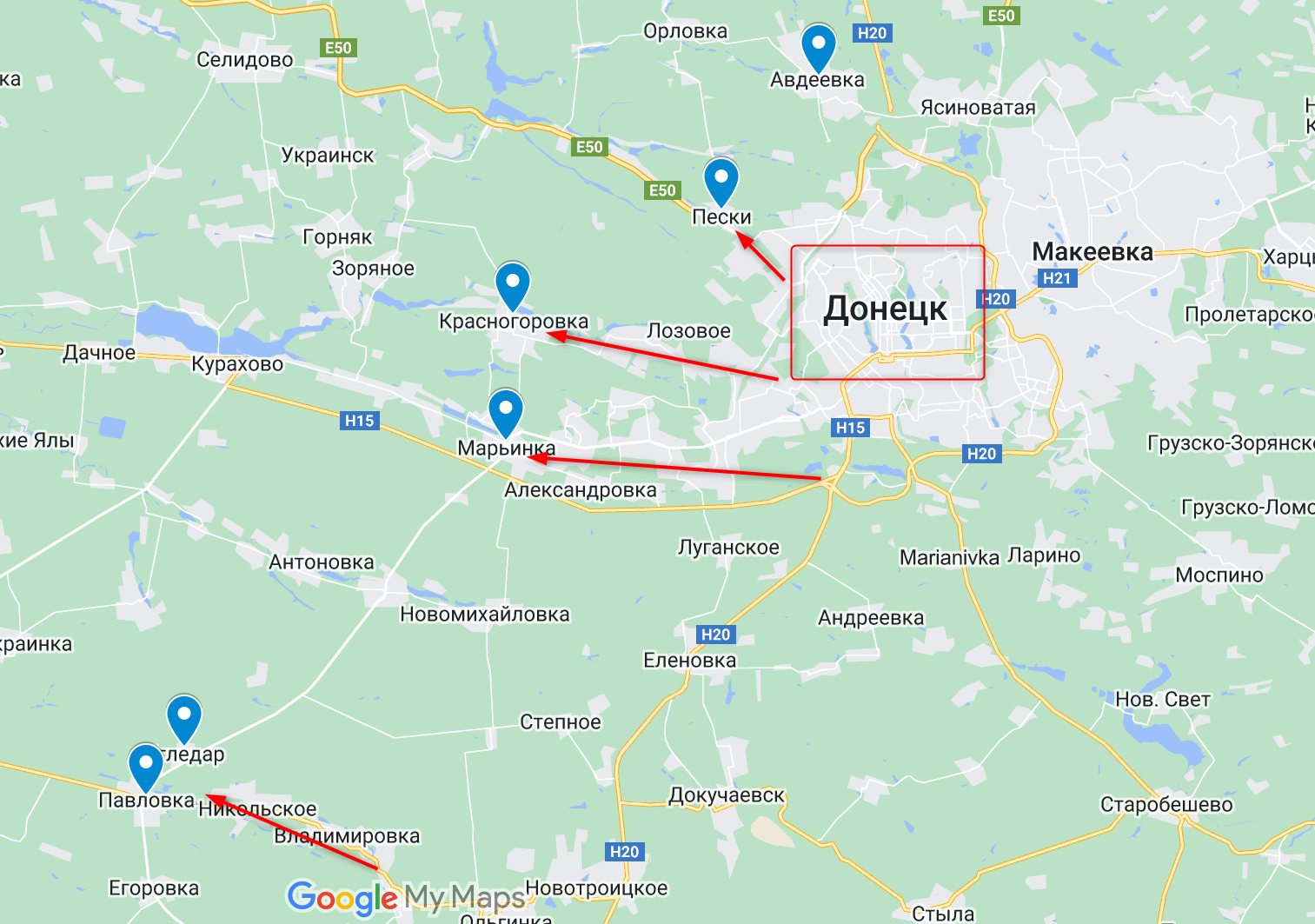 К западу от Донецка противник штурмовал Пески и Авдеевку, продолжается бой в районе Красногоровки. В "ДНР" вчера заявляли, что вошли на окраины Красногоровки. Также продолжаются бои в районе Марьинки и Павловки (ближе к Угледару).