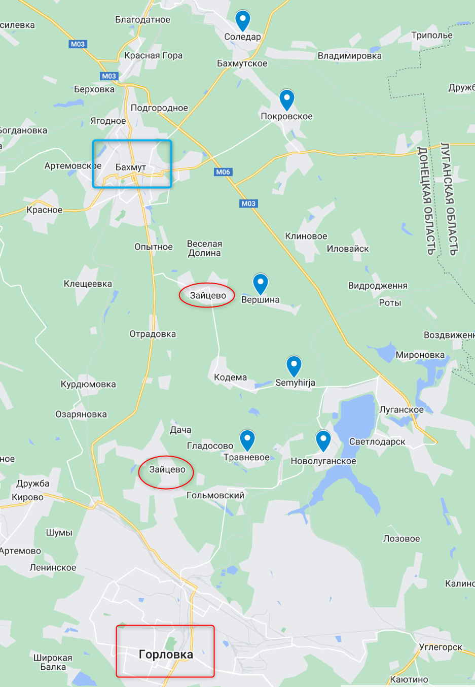 К югу от Бахмута россияне штурмовали Вершину и Травневое. Бои продолжаются у  Зайцево.