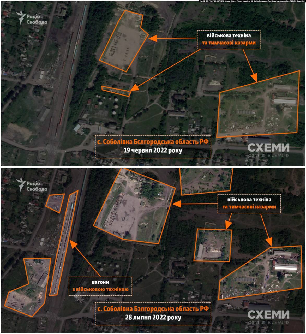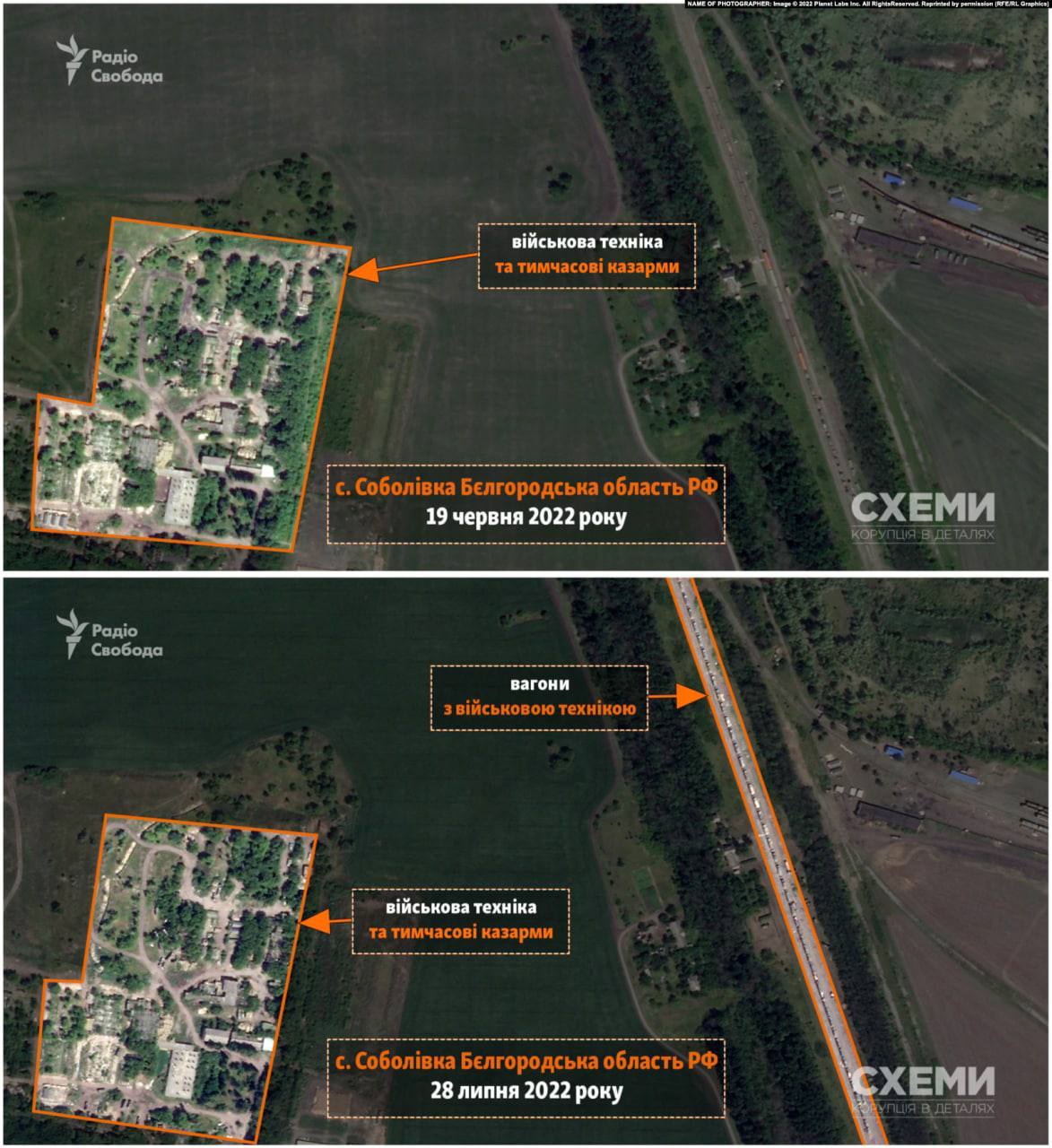 28 июля спутник зафиксировал в селе Соболевка Белгородской области РФ увеличение количества военной техники и личного состава русской армии - по сравнению со снимком из космоса этой местности за 19 июня.