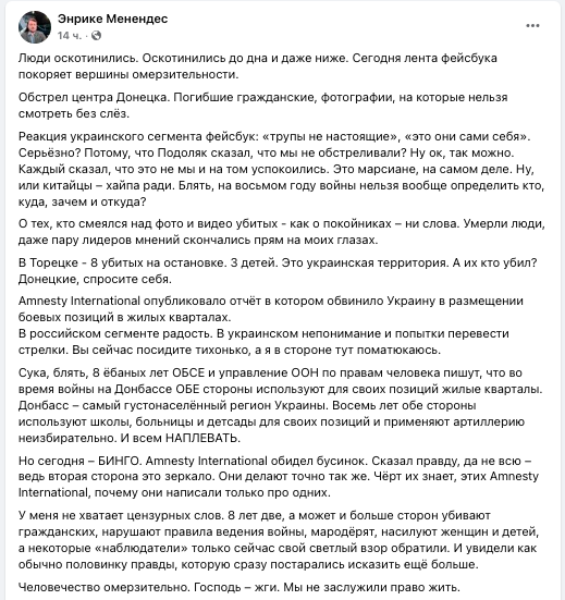 "Люди оскотинились. Оскотинились до дна и даже ниже. Сегодня лента фейсбука покоряет вершины омерзительности.