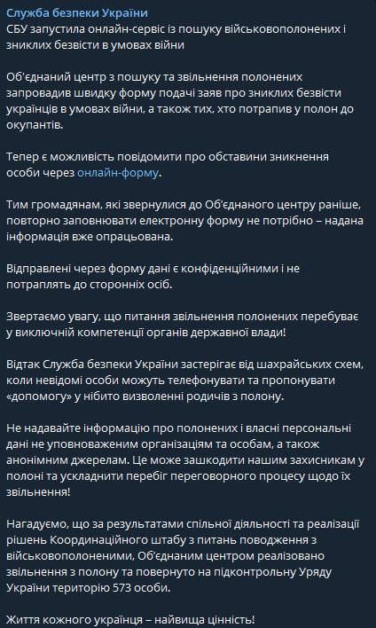 Также СБУ предостерегает от мошеннических схем, когда неизвестные могут звонить и предлагать "помощь" в якобы освобождении родственников из плена.
