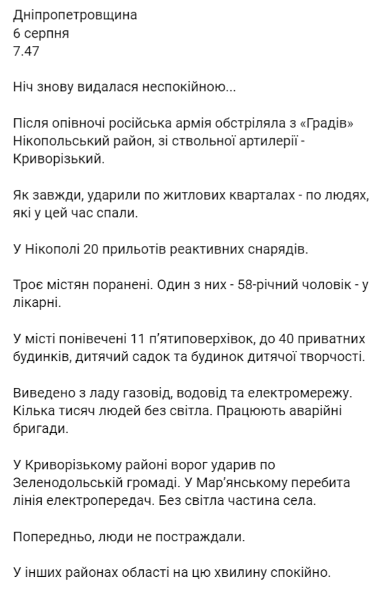В Днепропетровской области российские войска 6 августа после полуночи снова обстреляли два района: из "Градов" Никопольский район, из ствольной артиллерии – Криворожский. Ударили по жилым кварталам.