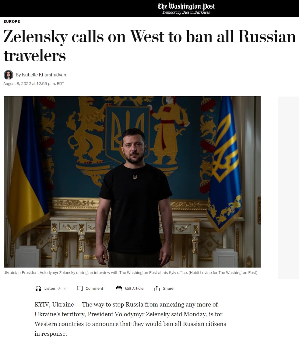 "Предложение Зеленского к Западу запретить въезд всем россиянам, вряд ли сильно расстроит Кремль. Наоборот, если эта идея осуществится, Кремль будет даже в выигрыше как минимум по двум пунктам:
