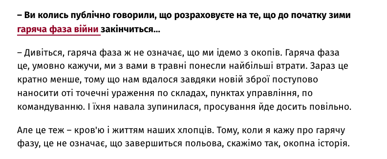 "Смотрите, горячая фаза ведь не значит, что мы уходим из окопов. Горячая фаза это, условно говоря, мы с вами в мае понесли самые большие потери. Сейчас это кратно меньше, потому что нам удалось благодаря новому оружию постепенно наносить точечные поражения по составам, пунктам управления, по командованию. И их наступление остановилось, продвижение идет довольно медленно. Но это тоже – кровью и жизнью наших ребят. Поэтому, когда я говорю о горячей фазе, это не значит, что завершится полевая, скажем так, окопная история", - сказал он.
