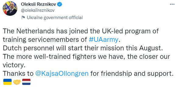 "Нидерланды присоединились к возглавляемой Великобританией программе обучения военнослужащих украинской армии. Нидерландский персонал начнет свою миссию в августе этого года. Чем больше у нас будет хорошо подготовленных бойцов, тем ближе будет наша победа. Спасибо, Кайса Оллонгрен (министр обороны Нидерландов - Ред.), за дружбу и поддержку", – написал Резников.