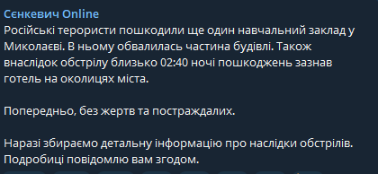 "В настоящее время собираем подробную информацию о последствиях обстрелов. Подробности сообщу впоследствии", - написал Сенкевич.
