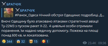 Нардеп Алексей Гончаренко сообщил, что удар был по базе отдыха в Белгород-Днестровском районе, одну из ракет удалось сбить.