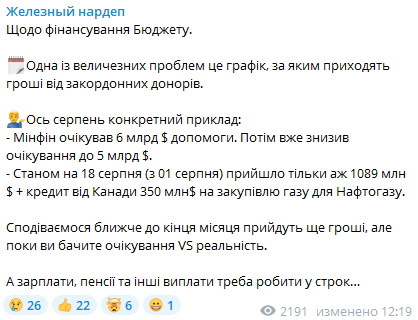 Он привел пример, что в августе Минфин ожидал 6 млрд помощи от зарубежных партнёров, а затем снизил ожидания до 5 млрд. Но по состоянию на 18 августа суммарно получены менее 1,5 млрд долларов (то есть менее трети от необходимой суммы - Ред.).