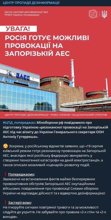 "Учитывая установление фактов почти непрерывных провокативных обстрелов Запорожской АЭС оккупационными войсками, сообщение о провокациях Силами обороны Украины не соответствует действительности и является откровенной дезинформацией!", - говорится в сообщении, к которому прикреплена картинка с текстом, что это сама РФ может готовить провокации.