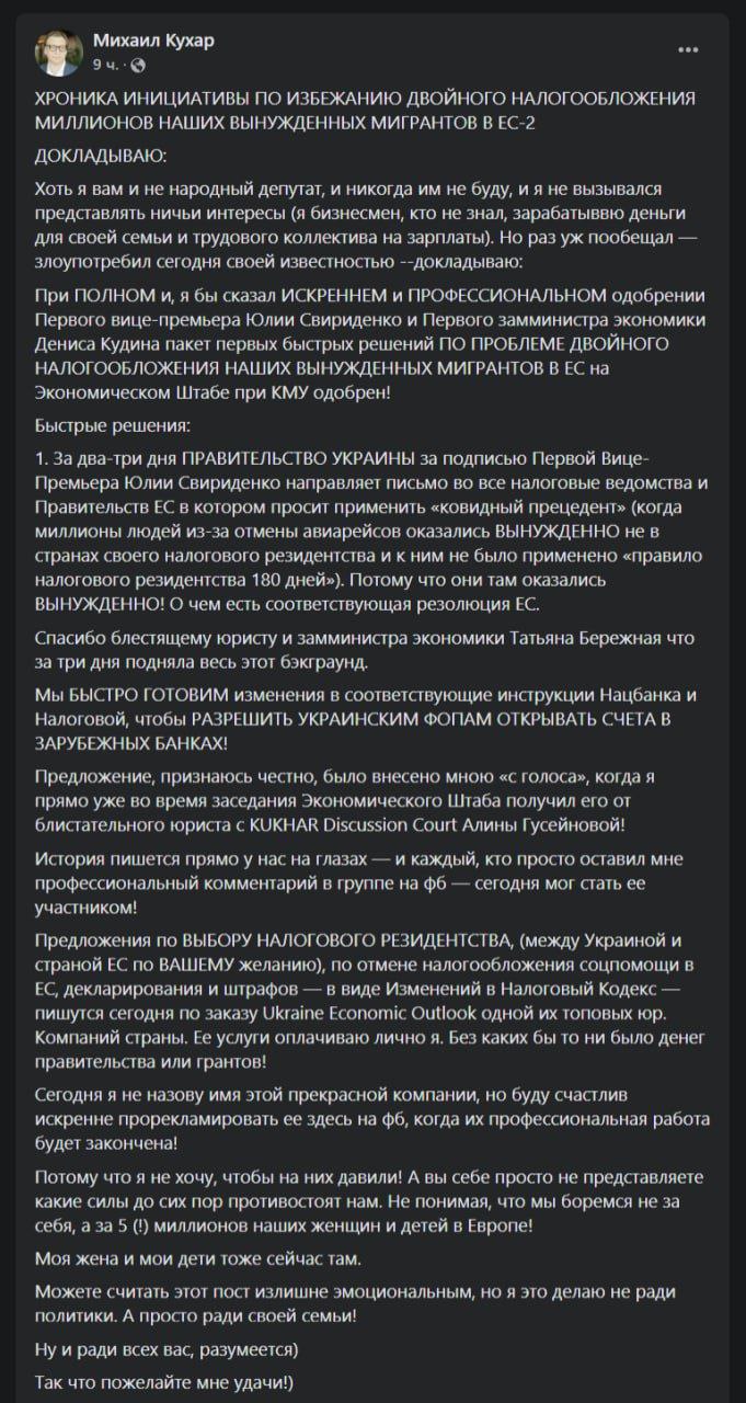 Как сообщил в Facebook член экономического штаба при Минэкономики Михаил Кухар, Украина предложит ЕС применить к украинским беженцам "ководный прецедент", чтобы избежать двойного налогообложения.