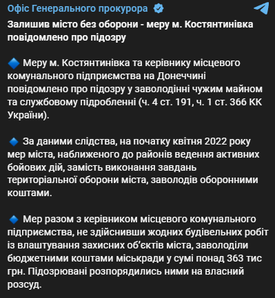 По данным следствия, в начале апреля мэр прифронтового города вместе с руководителем коммунального предприятия завладел средствами, предназначенными для укрепления обороны Константиновки - устройства защитных объектов.