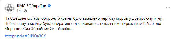 В Одесской области украинские военные обнаружили и обезвредили российскую морскую дрейфующую мину.