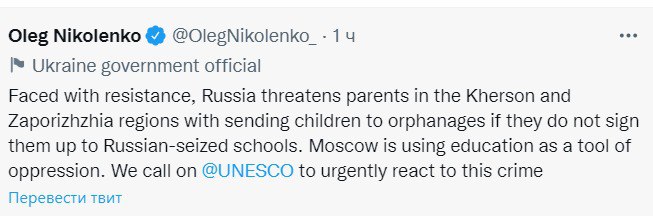 Украина призывает ЮНЕСКО отреагировать на то, что власти РФ заставляют родителей на контролируемых ею территориях отправлять детей в школы с помощью угроз. Об этом представитель МИД Украины Олег Николенко написал в Twitter.