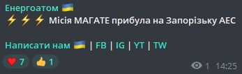 В 14:25 Энергоатом также сообщил, что миссия МАГАТЭ прибыла на Запорожскую АЭС.