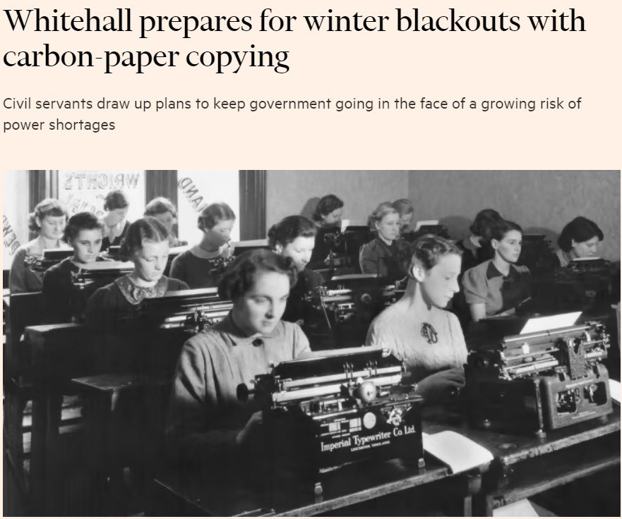 Правительство Великобритании может вернуться к использованию копировальной бумаги, если в результате энергетического кризиса в стране этой зимой придется прибегнуть к отключениям электричества.