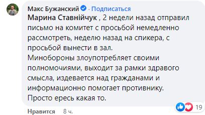 "Две недели назад отправил письмо на комитет с просьбой немедленно рассмотреть, неделю назад на спикера, с просьбой вынести в зал. Минобороны злоупотребляет своими полномочиями, выходит за рамки здравого смысла, издевается над гражданами и информационно помогает противнику. Просто ересь какая-то", - прокомментировал депутат Макс Бужанский.