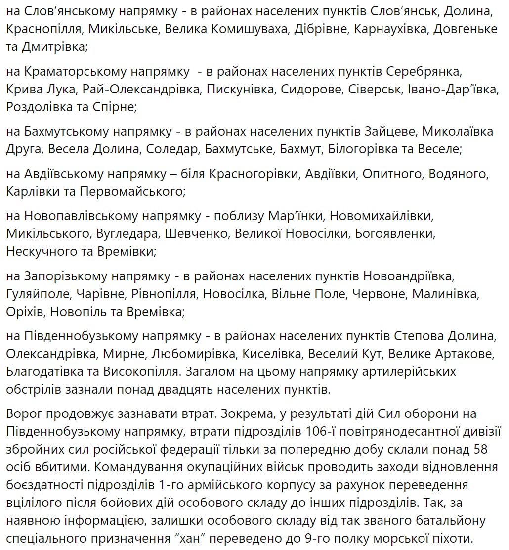 ВСУ успешно отразили наступательные действия противника в районах населенных пунктов Сосновка, Майорск, Николаевка Вторая, Зайцево, Веселая Долина, Бахмут, Первомайское и Новомихайловка.