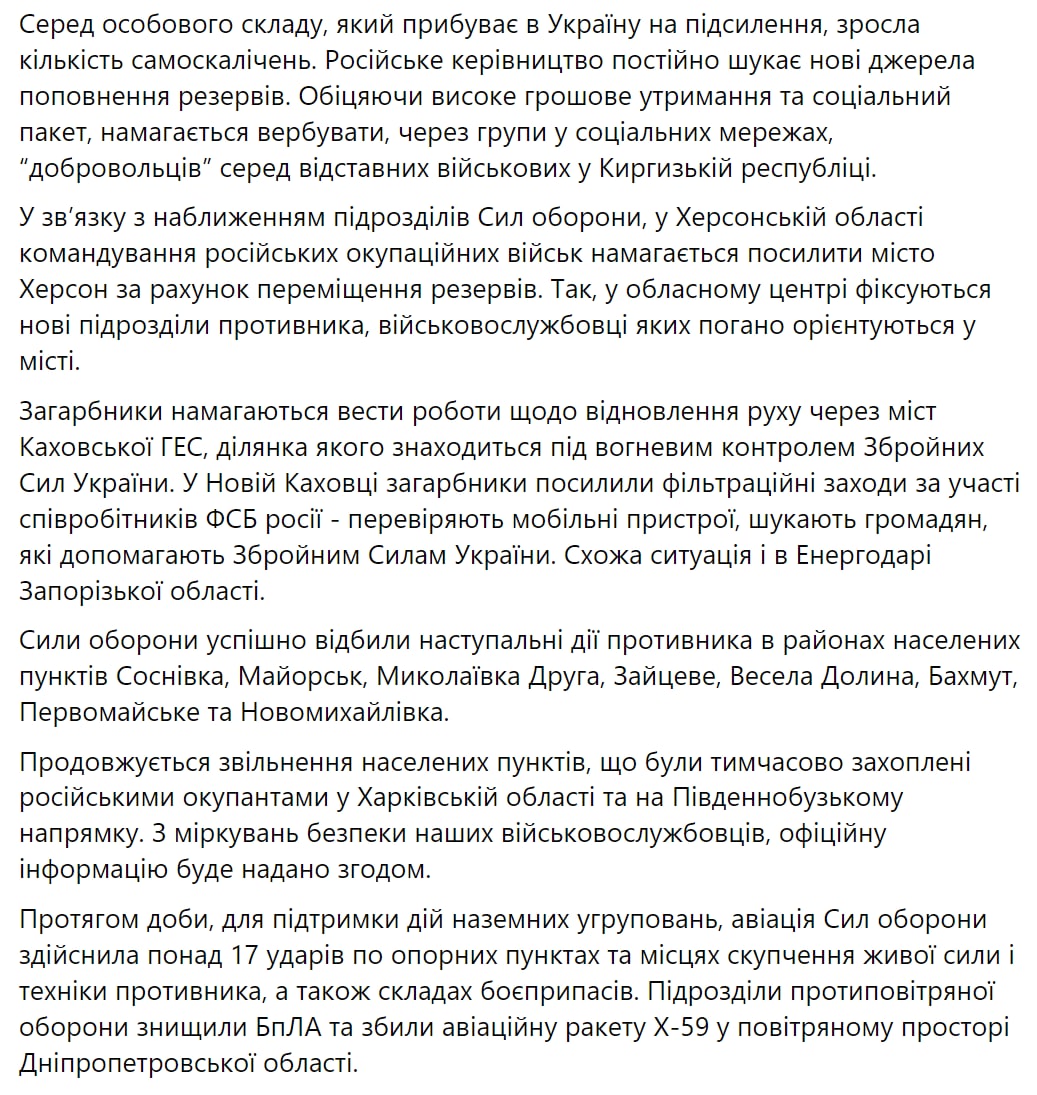 По данным Генштаба, командование российских войск пытается усилить оккупированный город Херсон за счет перемещения резервов. Фиксируются новые подразделения противника, военнослужащие которых плохо ориентируются в городе.