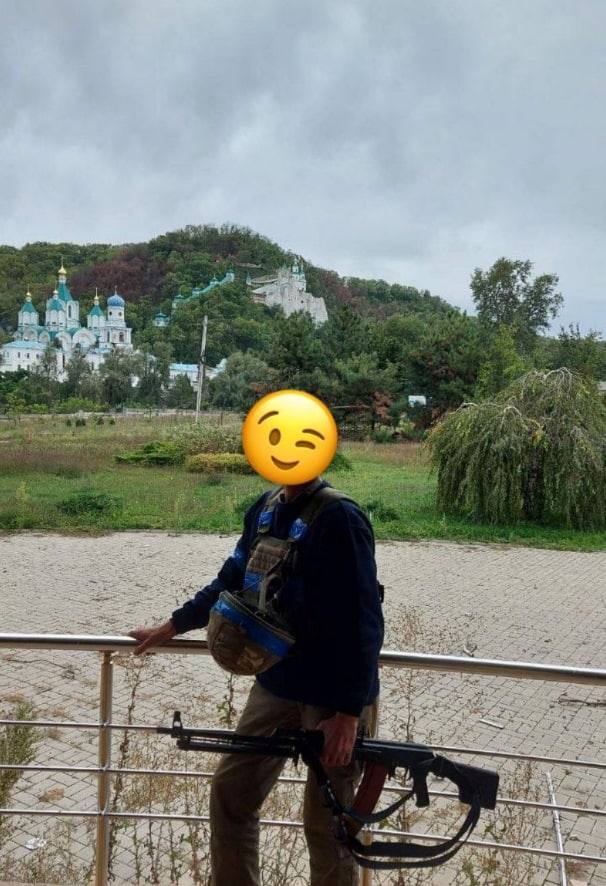 На первом снимке украинский военный позирует на фоне инсталляции в виде сердца с надписью на украинском языке: "Я город-герой Святогорск - место силы", на другой - стоит с автоматом на фоне Святогорской лавры, по которой ракетные удары наносились даже во время молебна.