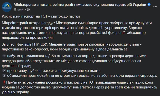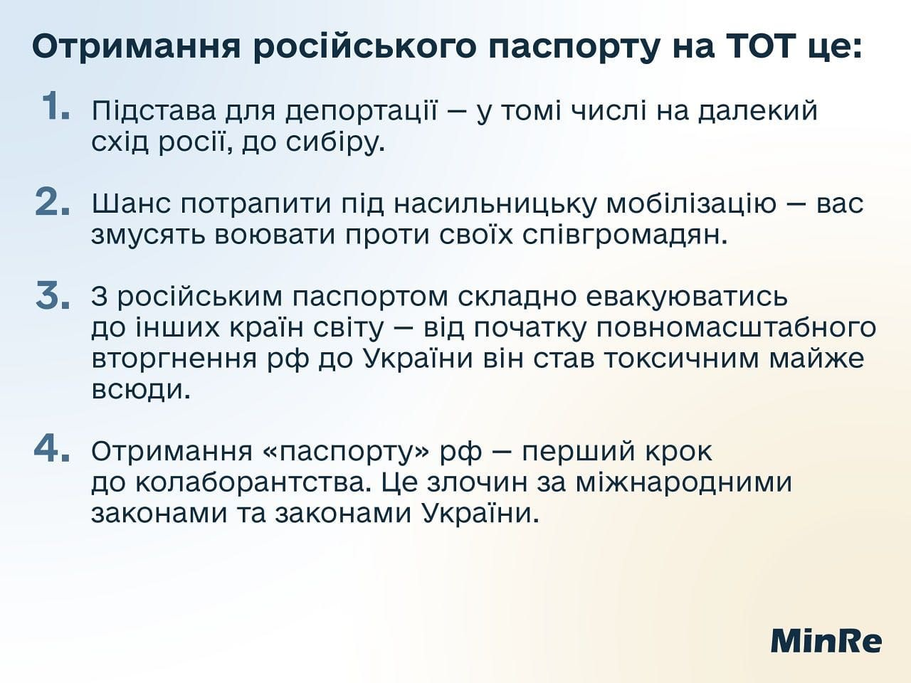 В сообщении заявляется, что получение российского паспорта на оккупированных территориях "оправдано только в случае, когда человек с помощью этого "документа" пытается через РФ и третьи страны вернуться в Украину".