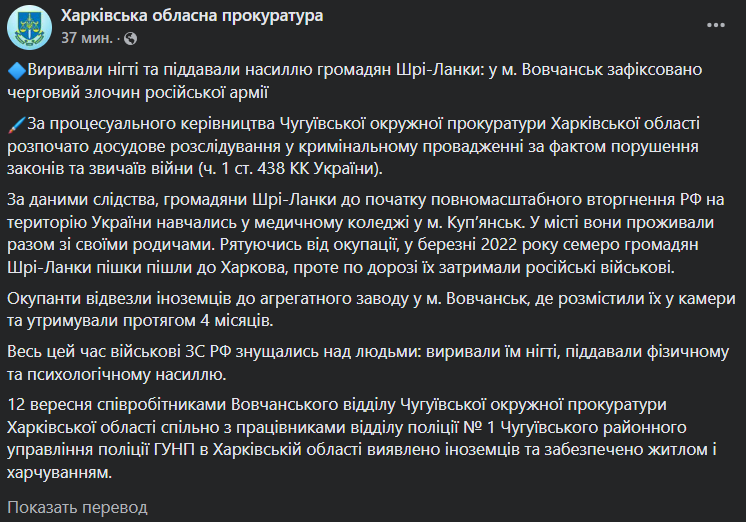 В Волчанске обнаружилась группа из семерых жителей Шри-Ланки, которые учились в медколледже Купянска, вместе с близкими после начала боевых действий пешком пошли в Харьков, но попали в плен к россиянам.