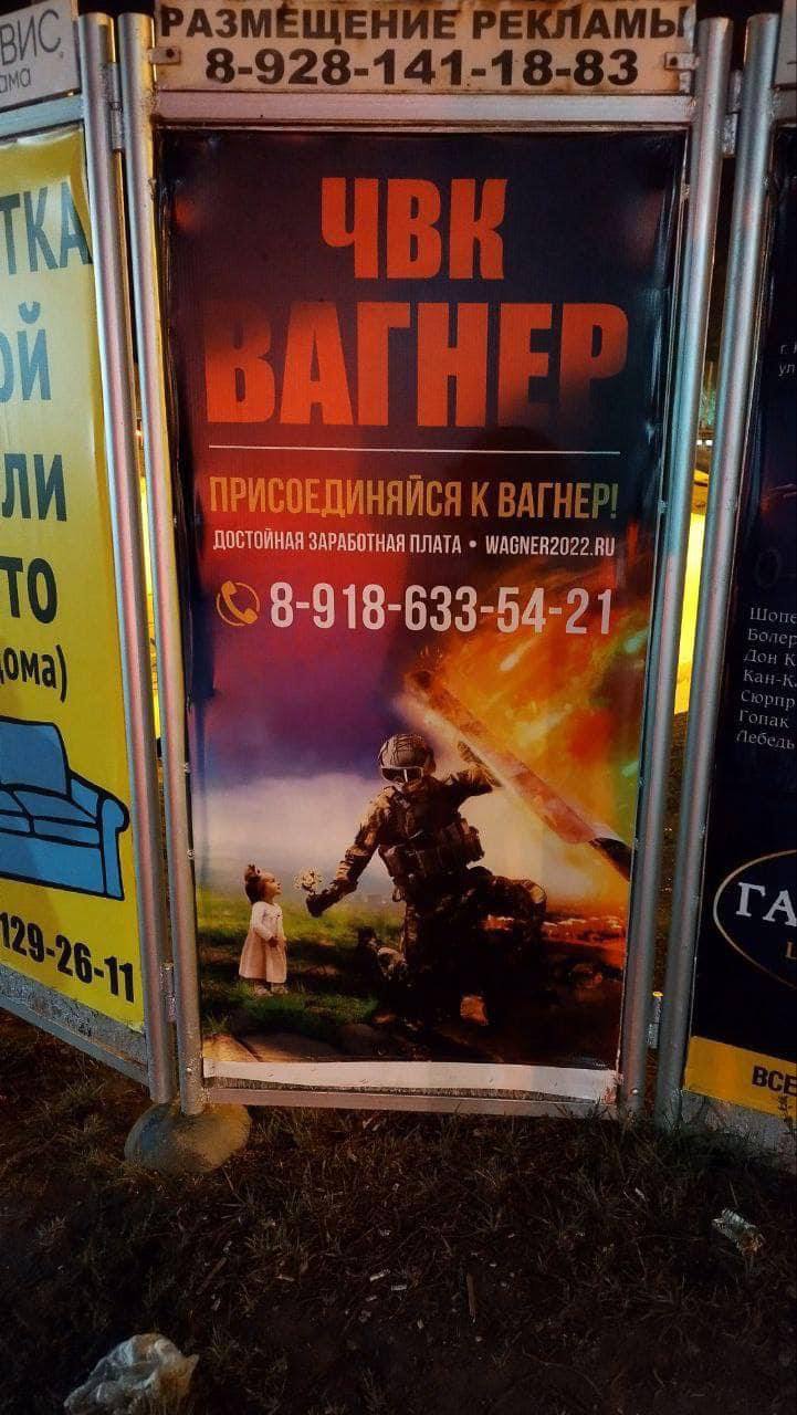 В городах Ростовской области на улицах появилась реклама с призывом вступать в "ЧВК Вагнера". Фото публикует "Радио Свобода", а также российские журналисты.
