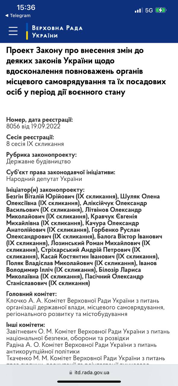 Соответствующие изменения к законодательству зарегистрировала группа депутатов от "Слуги народа" (главный автор Виталий Безгин) в законопроекте об усовершенствовании полномочий органов местного самоуправления.