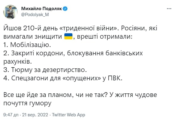 Советник главы Офиса президента Украины Михаил Подоляк отреагировал на заявление президента РФ Владимира Путина о частичной мобилизации.