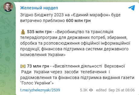 10.29 Финансирование национального единого телемарафона обойдется в 600 млн грн в 2023 году.