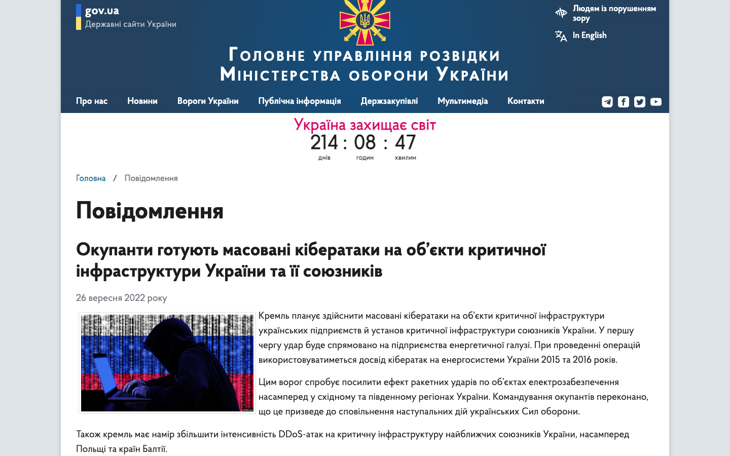 Украинская разведка заявляет, что РФ готовит массированные кибератаки на объекты критической инфраструктуры Украины, в частности, энергетической отрасли.