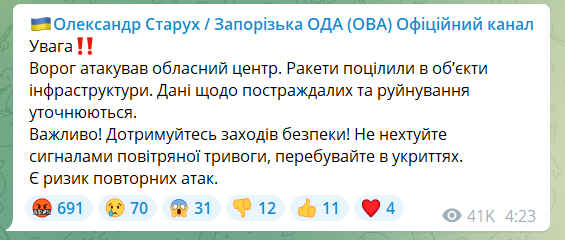 Об этом в телеграм-канале сообщил глава Запорожской ОВА Александр Старух.