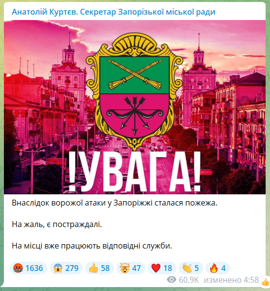 Секретарь Запорожского горсовета уточнил, что в результате вражеской атаки в Запорожье случился пожар. На месте работают соответствующие службы.