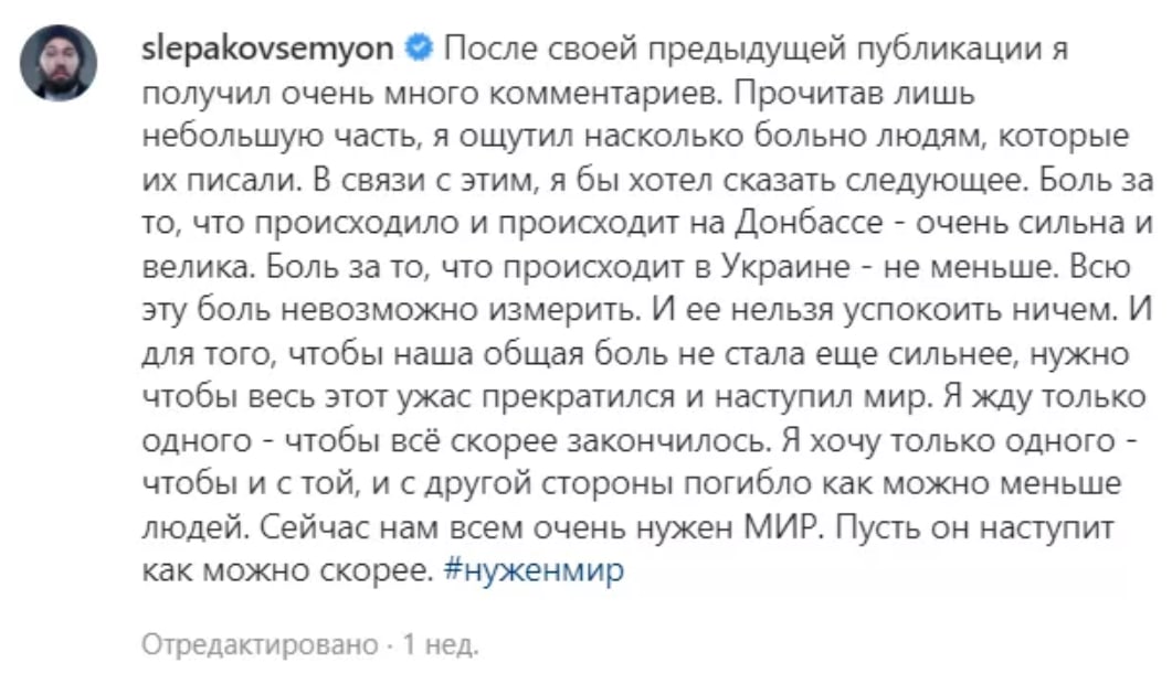 Напомним, что в самом начале войны Слепаков призвал Владимира Путина найти найти другое решение вопроса, чем война, и призывал к миру.
