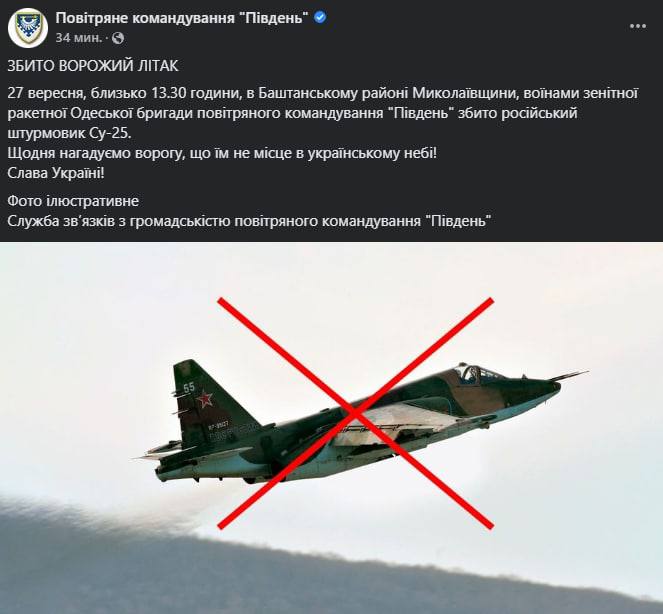 Во вторник, 27 сентября, в Баштанском районе Николаевской области около 13:00 военнослужащими зенитной ракетной Одесской бригады был сбит российский штурмовик Су-25, сообщают в воздушном командовании "Юг".