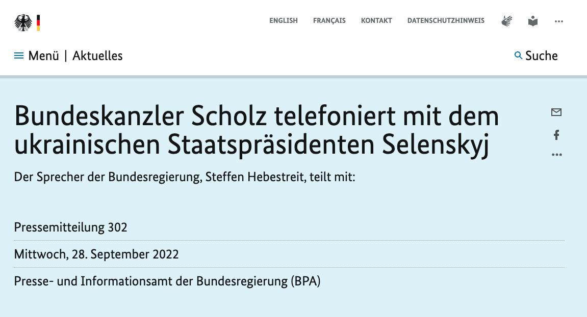 Канцлер Германии Олаф Шольц 28 сентября созвонился по телефону с президентом Украины Владимиром Зеленским. Они обсудили военную, политическую и экономическую ситуации в Украине и дальнейшую поддержку страны.