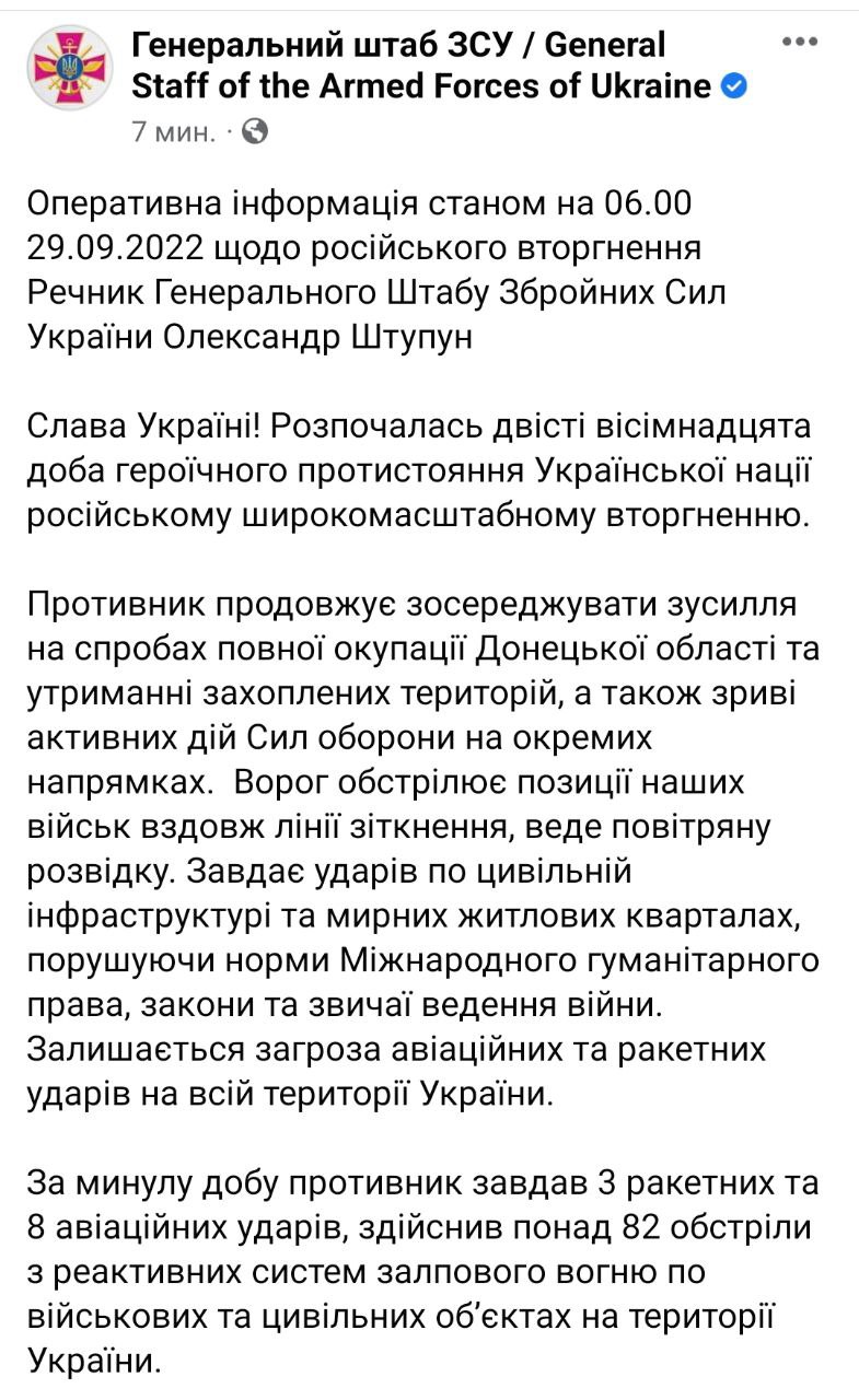 Генштаб ВСУ публиковал сводку о ситуации на фронте на утро 29 сентября.