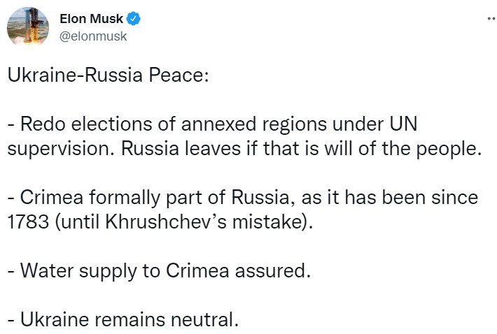 После того, как Подоляк задал Маску вопрос, хочет ли тот легитимизировать псевдореферендумы, проведенные Россией на аннексированных территориях, а Маск ответил, что предлагает референдум под наблюдением ООН, советник Ермака написал еще раз, отвергнув идею любого голосования.
